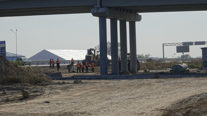 Кое-где работы все-таки ведутся. Несколько строителей остались не замеченными нами под мостом в самом начале пути.