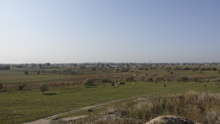 После моста разворачивается степная панорама. На первый взгляд вокруг только пустырь, холмы, на которых пасутся коровы. Где-то вдали виднеются частные дома ближайших поселков.