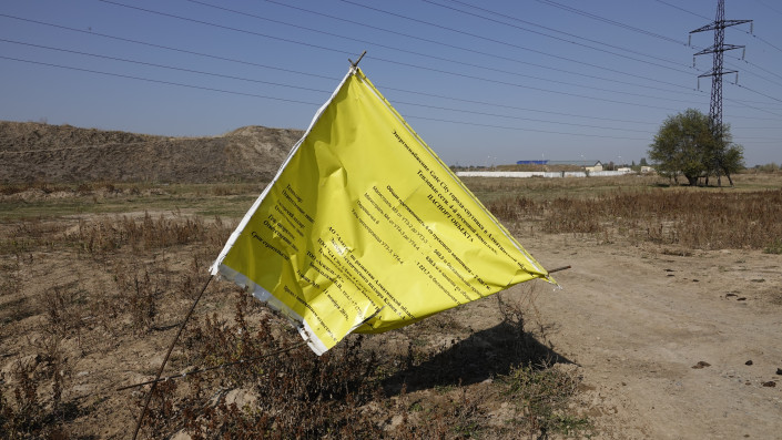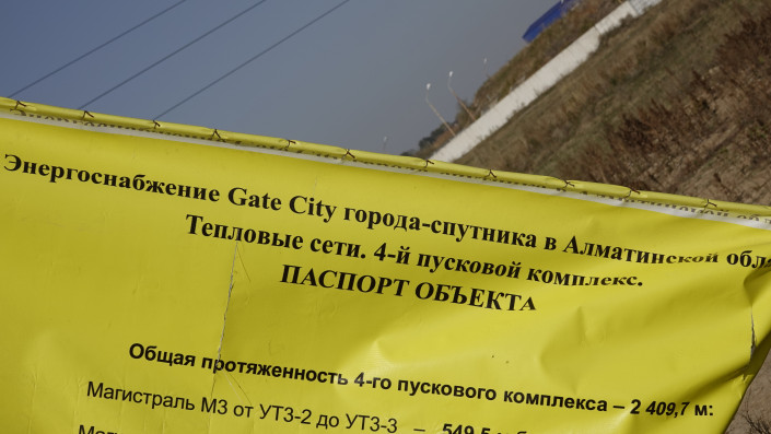 Проехавшись по степи, мы уже начали сомневаться, что приехали по адресу. Пока не увидели желтую вывеску. Это оказался паспорт объекта Gate Сity. "Энергоснабжение города-спутника (...) Просим отнестись с пониманием к временным неудобствам", - написано на нем.