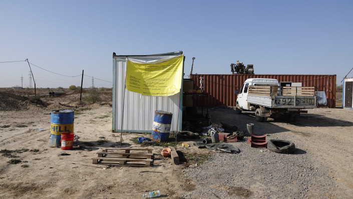 Проехав значительную часть территории, мы наконец нашли лагерь строителей. Бараки рабочих установлены рядом с небольшой водонапорной башней, вокруг лежат десятки труб.