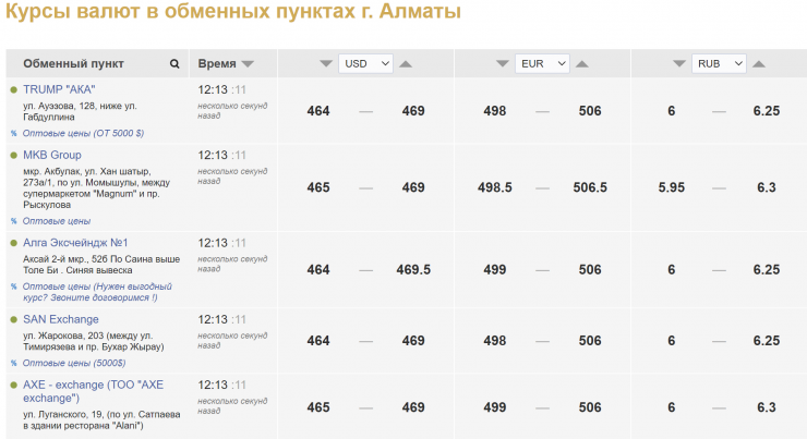 В обменных пунктах Алматы ситуация с долларом незначительно лучше, в среднем продажа сложилась на уровне 469 тенге. Но и покупают американскую валюту алматинские обменники дешевле - в среднем по 464-465 тенге.