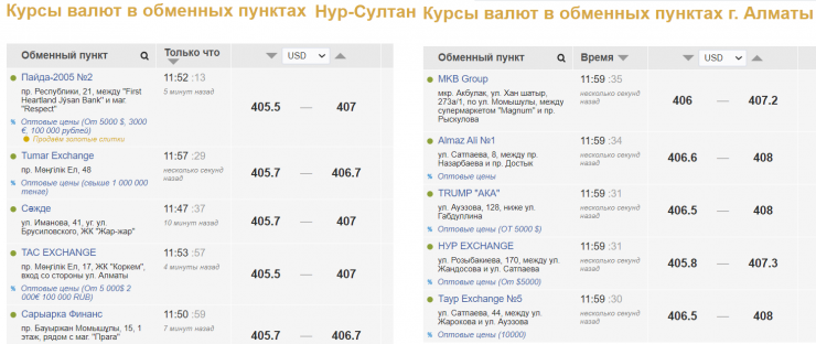 В обменных пунктах Нур-Султана доллар продают за 406,7 - 407 тенге, покупают за 405,5 - 405,7 тенге.
