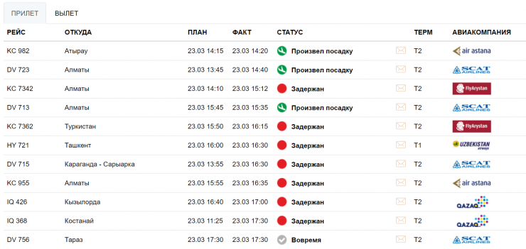 "В связи с погодными условиями отменен рейс Нур-Султан - Жезказган. Штормовое предупреждение действительно с 11.00 до 18.00. Ожидается усиление ветра с порывами до 12-17 метров в секунду. В связи с метеоусловиями два рейса отправлены в Алматы. Это рейс Шымкент - Нур-Султан и Костанай - Нур-Султан. Просим отнестись с пониманием, мы делаем все для безопасности пассажиров", - сообщил пресс-секретарь Международного аэропорта Нурсултан Назарбаев Анвар Шалекенов.