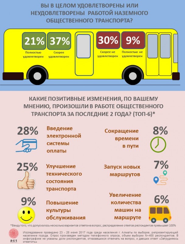 Респонденты отмечают следующие позитивные изменения: введение электронной системы оплаты (28 процентов), улучшение технического состояния транспорта и появление более современных автобусов/троллейбусов (25 процентов), повышение культуры обслуживания (9 процентов). По мнению алматинцев, сократилось время в пути благодаря внедрению выделенных полос (8 процентов), появились новые маршруты (7 процентов), увеличилось количество машин на маршруте (6 процентов).