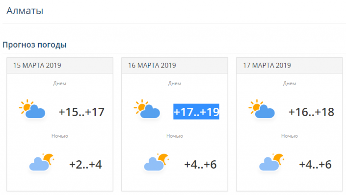 В Астане похолодает уже ночью. 16 марта днем ожидается температура -3...-5, ночью -8...-10. 17 марта ночью температура упадет до -17 градусов. В Алматы температура будет находиться в это время в пределах +15...+18. В Шымкенте ожидается температура +21...+23 градуса тепла.