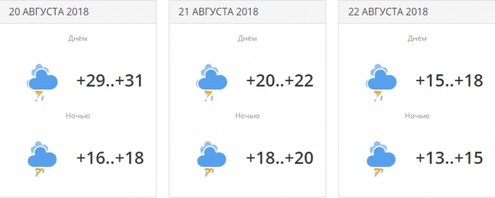 Синоптики прогнозируют переменную облачность в течение трех дней и температуру около 30 градусов тепла. Ночью 20 августа ожидается дождь с грозой.