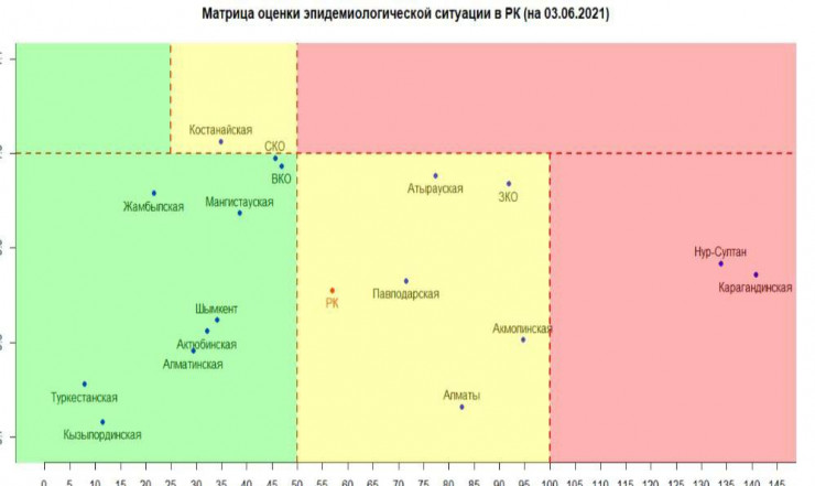 Согласно матрице оценки эпидемиологической ситуации в регионах Казахстана на 3 июня, в "красной" зоне находятся Нур-Султан и Карагандинская область.