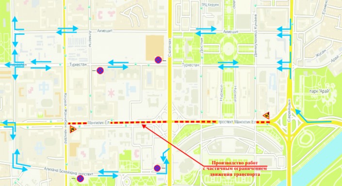 "На период закрытия улицы рекомендуем осуществлять движение в объезд данного участка через улицу Сарайшык на улицу Туркестан и на улицу Акмешит (при движении со стороны правого берега), а также через улицу № 24 и Бокейхана (при движении со стороны аэропорта). В целях увеличения пропускной способности по предлагаемым маршрутам будут изменены режимы работы светофоров на перекрестках и исключена остановка/стоянка автомашин вдоль проезжей части путем установки соответствующих дорожных знаков", - проинформировали в ДВД.