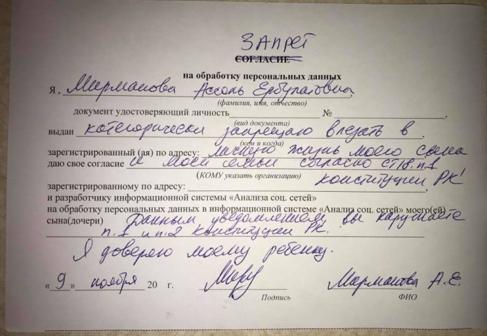 "Шумиха по этому поводу прошла еще полгода назад, но затихла. А сейчас начали по новой собирать. Тогда просили предоставить логины и пароли детей, сейчас просто просят разрешения следить за детьми в Сети. Какую бы разъяснительную работу в школах ни проводили, само существование этой бумажки нелегитимно. В бланке ни названия конторы, ни адреса, ни печати. Неизвестно, куда дальше пойдут данные о наших детях", - отметила Акишева.