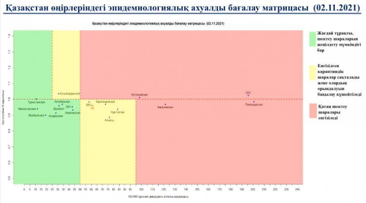 Согласно матрице оценки эпидемиологической ситуации в регионах Казахстана на 2 ноября, в "красной" зоне находятся: Костанайская, Павлодарская, Акмолинская и Северо-Казахстанская области.