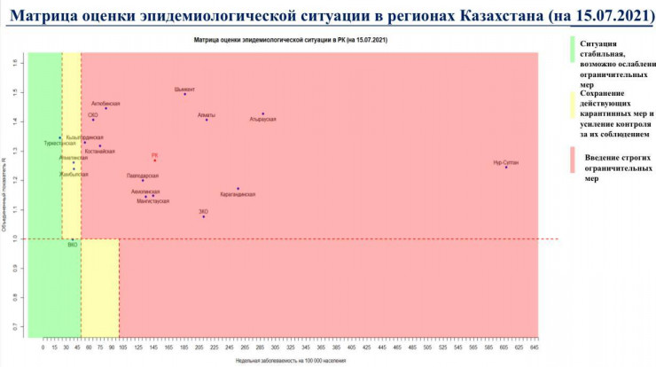 Согласно матрице оценки эпидемиологической ситуации в регионах Казахстана, на 15 июля в "красной" зоне находятся города Нур-Султан, Алматы, Шымкент, Акмолинская, Актюбинская, Атырауская, Западно-Казахстанская, Карагандинская, Костанайская, Кызылординская, Мангистауская, Павлодарская и Северо-Казахстанская области.