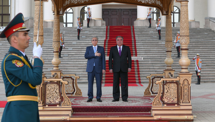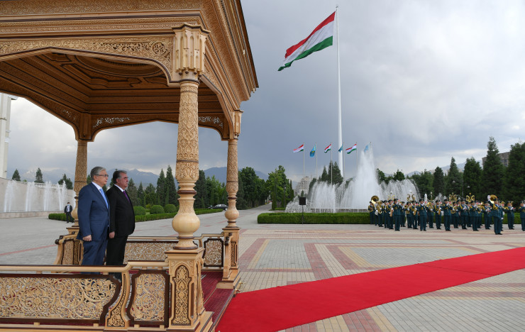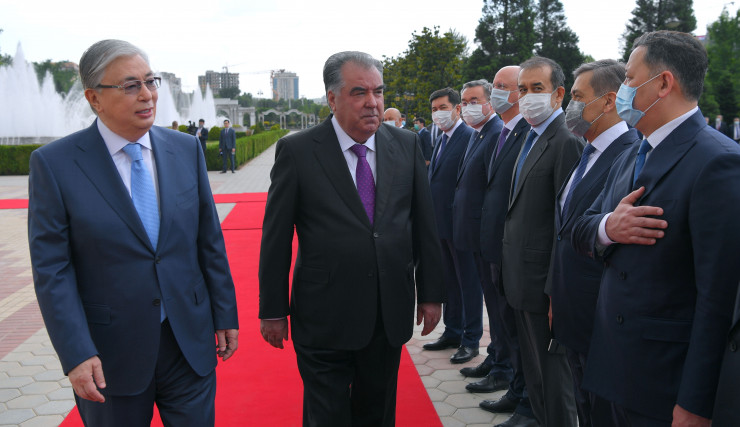 Затем Касым-Жомарт Токаев и Эмомали Рахмон прошли вдоль строя почетного караула и представили друг другу членов официальных делегаций.