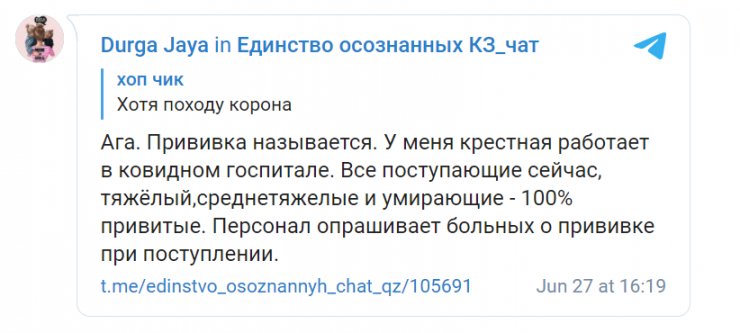Сообщение о том, что COVID-госпитали заполнены тяжелобольными и умирающими людьми, получившими вакцину против КВИ, появилось в казахстанском Telegram-канале. Эту информацию опровергли в Министерстве здравоохранения Казахстана, передает Tengrinews.kz со ссылкой на StopFake.