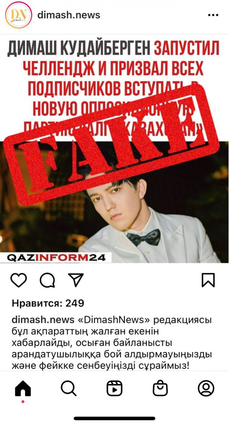 В социальных сетях распространился фейковый призыв от имени певца Димаша Кудайбергена вступать в оппозиционную партию "Алга, Казахстан", передает Tengrinews.kz со ссылкой на Stopfake.kz.
