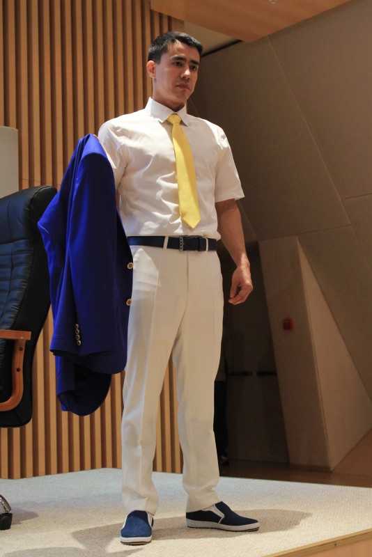 "Мы отошли от того, чтобы использовать в формировании цветовой гаммы мотивы национального флага. Мы делаем по-другому. Цвет синий и яркий. Брюки бежевые. Они хорошо сочетаются. Подобрали обувь. Материал - это шерсть с лавсаном. Специально так сделали, чтобы повысить ее практичность, - прокомментировал директор "Казлегпром-Алматы" Айбек Бектурганов. - Что касается критики, то я понял одно: десять человек - десять мнений. Первый вариант, платье, сначала выбрали, теперь он им не понравился... Второй вариант лучше. Сейчас будем дорабатывать".