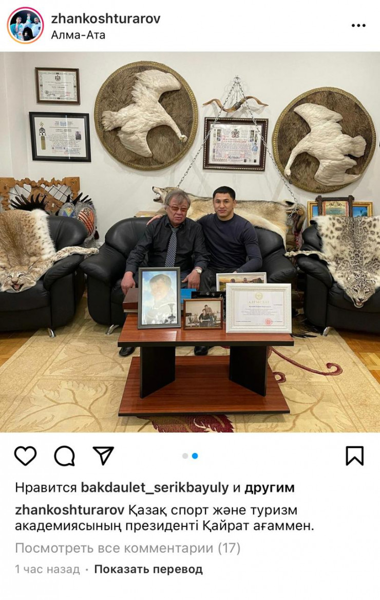 Фото с Кайратом Закирьяновым выложил в Instagram спортсмен Жанкош Тураров. На снимках показаны шкуры и чучела льва, рыси, барсов и птиц, на фоне которых мужчины фотографируются.