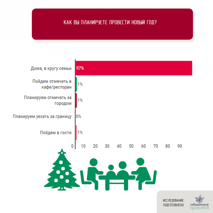 По их информации, 97 процентов респондентов планируют провести Новый год в кругу семьи и лишь 1 процент опрошенных пойдет отмечать праздник в кафе или ресторан.