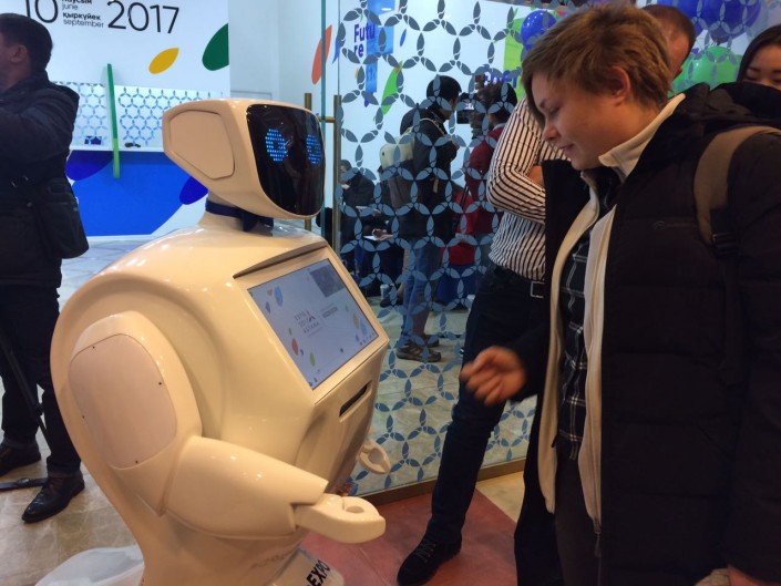"Он разработан для общения в условиях большого скопления людей. Очень общительный, отвечает на все прямые и косвенные вопросы. Выдает всю информацию, играет, показывает фильмы. Он разработан студентами Московского технологического института, поддерживает русский, китайский и английский языки. Если ему задают вопросы на других языках, то он ищет ответы в интернете. Работает через WI-FI, подключен к поисковику Google. Может продать билет, открыть ссылку на онлайн продажи билетов и вы через его терминал можете купить билет. У него есть полноценный браузер, через который можно спокойно пользоваться интернетом, а также фотокамера с моментальной распечаткой фотографий. Он предназначен для презентации, информации, рекламы", - рассказали на открытии кассы в Астане.