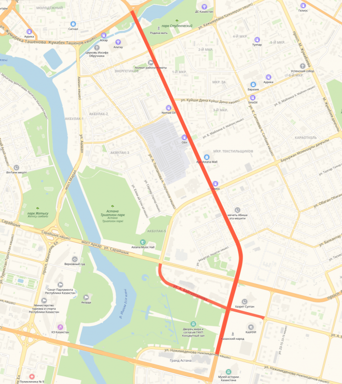Также движение автомашин будет ограничено по улице Байтурсынова со стороны улицы Аманжолова и со стороны проспекта Момышулы, по проспекту Тәуелсіздік со стороны улицы Нажимеденова.