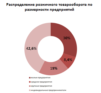 При этом наибольшая часть товарооборота приходится на индивидуальных предпринимателей, на втором месте - малые предприятия, на третьем - крупные компании.