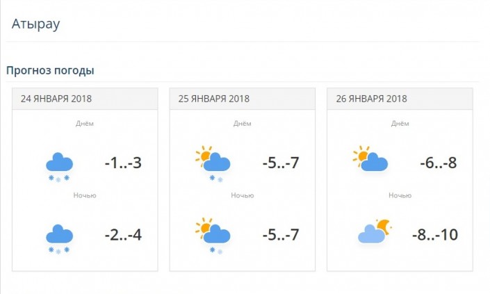 В двух городах на западе Казахстана - в Атырау и Уральске - выдалась относительно не холодная погода. В Атырау 24 января ожидается снег, -1...-3 градуса. 25 января и 26 января дневная температура понизится до 5-8 градусов мороза. В Уральске 24 января температура воздуха 3-5 градусов мороза. 25 и 26 января ожидается снег, дневная температура воздуха составит 8-10 градусов мороза.