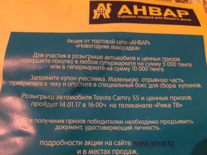 Согласно условиям конкурса, описанным на одном из буклетов, необходимо было совершить покупку на сумму от 5 до 10 тысяч тенге, заполнить купон участника и в условленное время прийти на мероприятие в гипермаркет по улице Нокина.