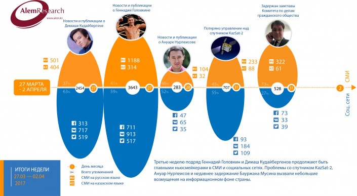 Третью неделю подряд казахстанский боксер Геннадий Головкин продолжает быть главным ньюсмейкером в СМИ и социальных сетях. Его имя с 27 марта по 2 апреля упоминалось 3 643 раза. Напомним, боксер одержал победу над американцем Дэниэлом Джейкобсом и защитил титулы чемпиона мира по версиям WBA (Super), WBC, IBF и IBO. Впервые в карьере GGG провел на ринге все 12 раундов.