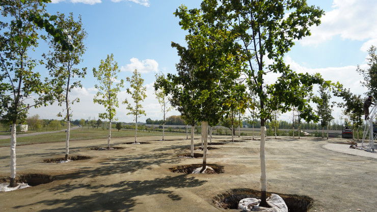 Вокруг центрального дуба высаживают молодые деревья.