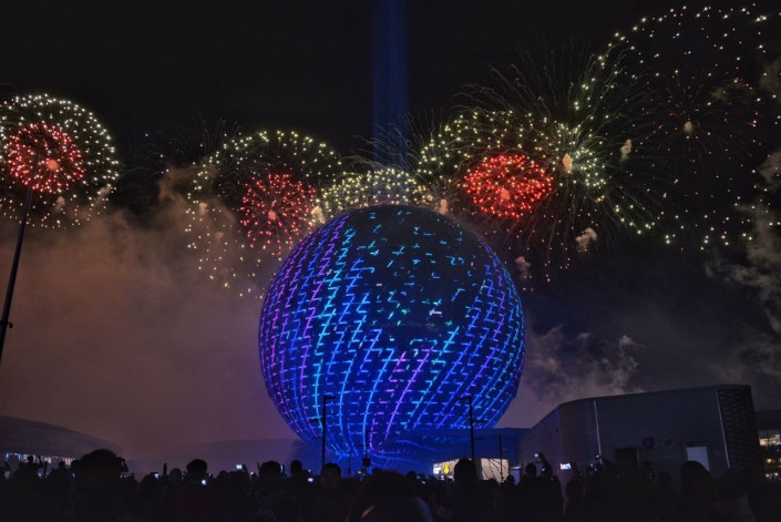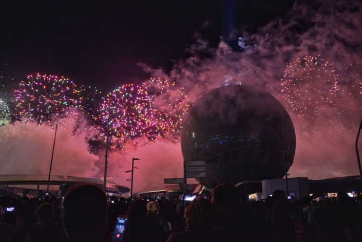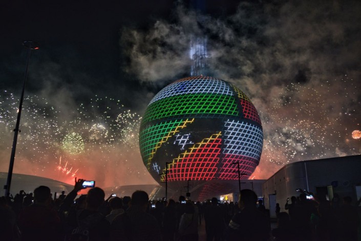 Во время салюта был активно задействован центральный павильон выставки - сфера "Нур Алем", транслировавший световое шоу.