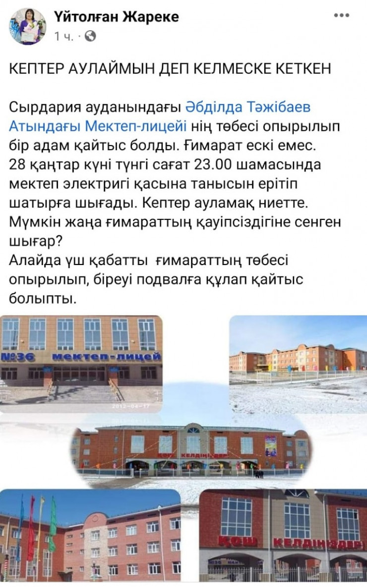 "В Сырдарьинском районе рухнула крыша школы-лицея имени Абдильды Тажибаева. Здание не старое. 28 января около 23 часов ночи школьный электрик месте со своим знакомым забрались на крышу, чтобы половить голубей. Однако крыша трехэтажного здания рухнула и один из них упал в подвал и скончался", - написала она в посте.