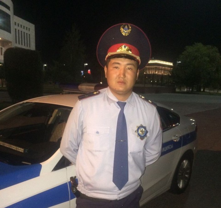 По словам Сагынбекова, он второй год служит в правоохранительных органах и пятый год живет в Астане. Родом он из Шымкента. На данный момент является младшим лейтенантом полиции, старшим инспектором службы шестого взвода.
