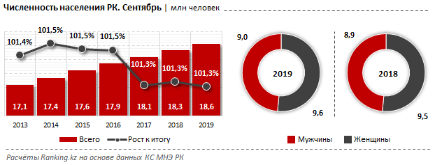 В сентябре в Казахстане проживало 18,6 миллиона человек, это на 1,3 процента больше, чем год назад. Доля женского населения в текущем году составила 51,5 процента, или 9,5 миллиона человек.