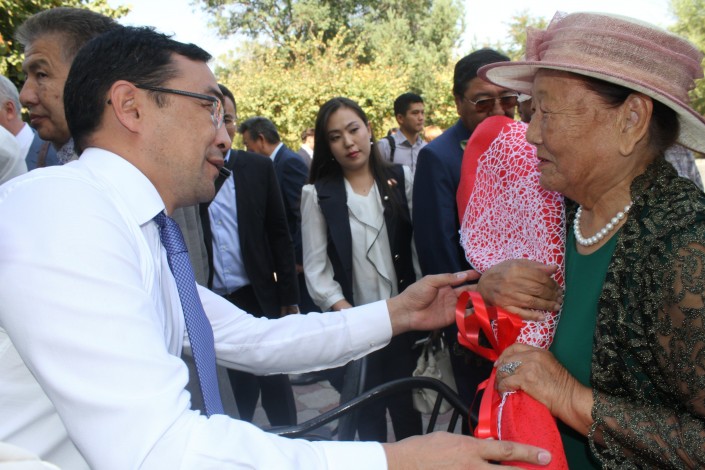 Заместитель акима Алматы Арман Кырыкбаев поздравляет дочь Узакбая Кулумбетова. Фото©Tengrinews.kz