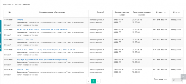 16 июня на сайте государственных закупок появилось несколько лотов на покупку техники Apple. Организатором значится товарищество с ограниченной ответственностью "Инвестиционный фонд малого и среднего бизнеса".