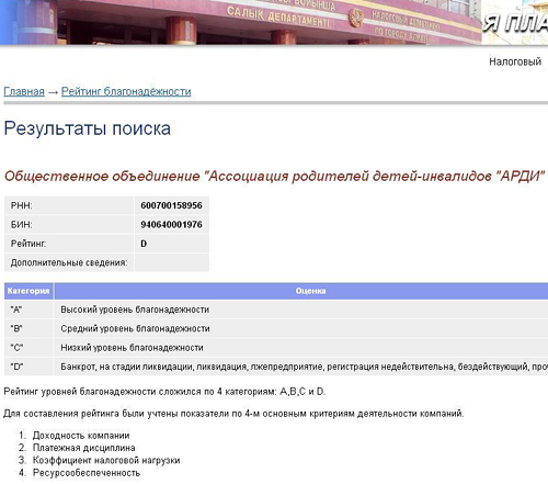 Дело в том, что если ввести РНН 600700158956 и БИН 940640001976, принадлежащие ОО "Ассоциация родителей детей-инвалидов "АРДИ", в специальную форму в разделе портала НДА "Проверь компанию на благонадежность" , то пользователь увидит, что этому НПО присвоен рейтинг благонадежности D. Оценка расшифровывается как "предприятие банкрот," "на стадии ликвидации", "ликвидация", "лжепредприятие", "регистрация недействительна", "бездействующий". Также к этой категории относят и прочие организации, которые по разным причинам не могут быть занесены в более высокие категории по показателям доходности компании, платежной дисциплины, коэффициента налоговой нагрузки или ресурсообеспеченности.