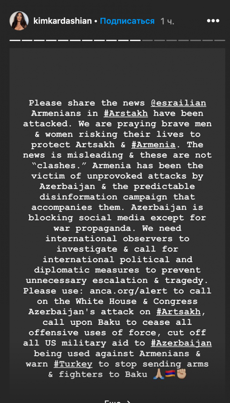 Ал актриса, фотомодель Ким Кардашьян Әзербайжанмен қақтығыста Арменияны қолдады. Кардашьянның пікірінше, Армения Әзербайжанның негізсіз шабуылына ұшырап, Бакудың жалған ақпарат тарату науқанының құрбаны болған.