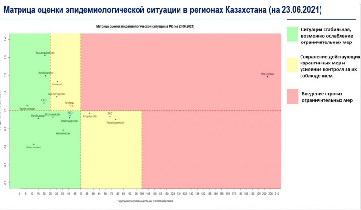 Согласно матрице оценки эпидемиологической ситуации в регионах Казахстана на 23 июня, в "красной" зоне находится Нур-Султан.