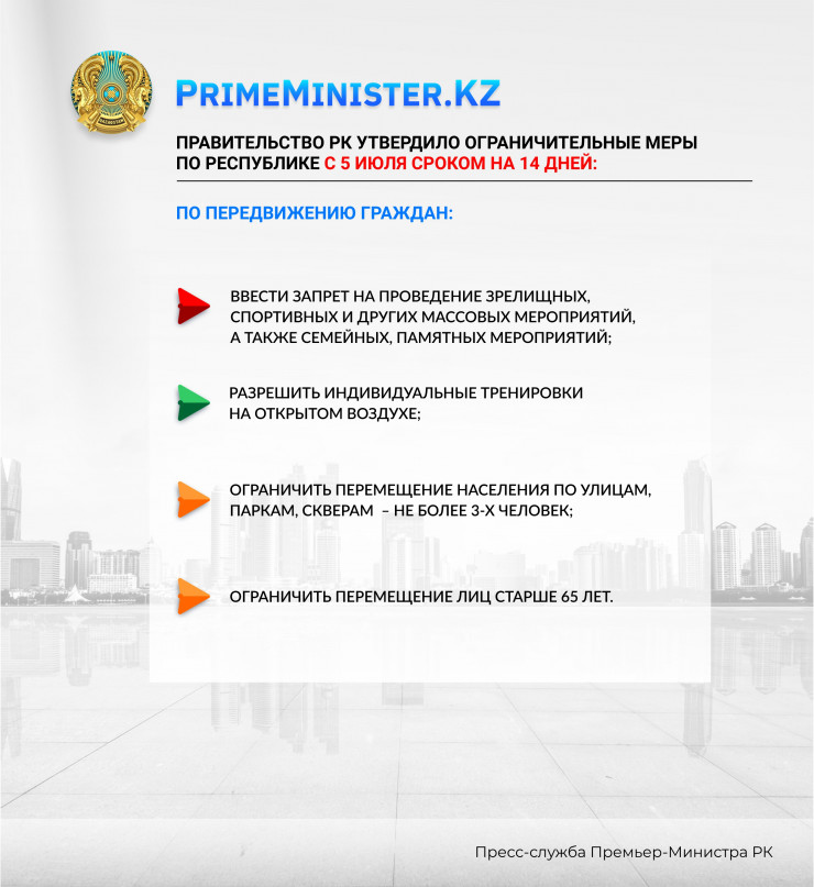 Госкомиссия утвердила меры по стабилизации эпидемиологической ситуации в Казахстане с 5 июля на 14 дней.