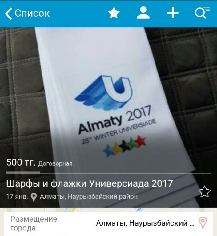 На волне популярности игр неплохо идет и различная атрибутика. К примеру, шарфы и флажки Универсиады-2017 на olx можно купить по 500 тенге. Брендированные чехлы на телефоны с логотипом игр оценивают в 3 000 тенге.