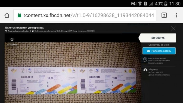 В Интернете появилось объявление о продаже билетов на церемонию закрытия Универсиады-2017 за 50 тысяч тенге, передает корреспондент Tengrinews.kz. Вместе с тем, по данным официального сайта fisutickets.com, стоимость билетов на церемонию закрытия Игр не превышала 13 тысяч тенге. Однако тикетов на закрытие Игр в официальной продаже уже нет.
