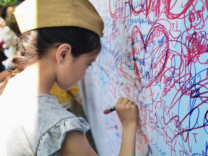 12.38. Алматы. Девочка пишет слова благодарности. "Ата, спасибо за победу!", "Мы всегда будем вас помнить", "Спасибо вам за мир!", - пишут юные жители города на стенде в парке имени 28 гвардейцев-панфиловцев.