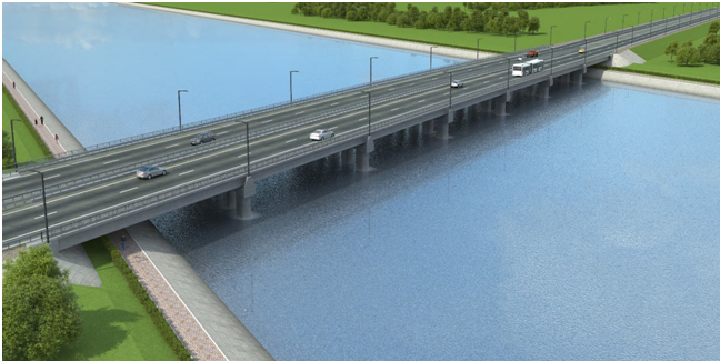 234-метровый мост через основное русло будет расположен на 32-м километре автодороги и иметь четыре полосы автомобильного движения, по 3,75 метра в ширину каждая, и полосы безопасности по 2 метра.