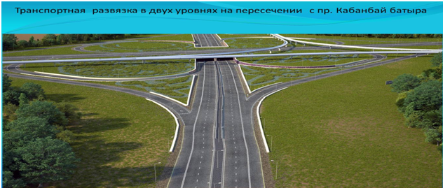 На пересечении с проспектом Кабанбай батыра построят развязку туннельного типа, Обход пройдет по нижней части, а проспект Кабанбай батыра - по верху.