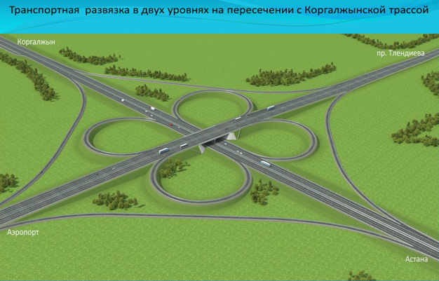 Похожая развязка появится на пересечении с Коргалжынской трассой. Обход также пройдет по верхней части по путепроводу.