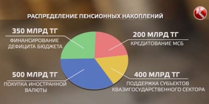 Еще в начале этого года власти Казахстана решили, куда вложить 1,5 триллиона тенге пенсионных накоплений. 200 миллиардов направили в виде кредитов предпринимателям, 400 миллиардов на поддержку нацкомпаний, на 500 миллиардов закупили иностранную валюту, еще 350 миллиардов ушли на финансирование дефицита бюджета.