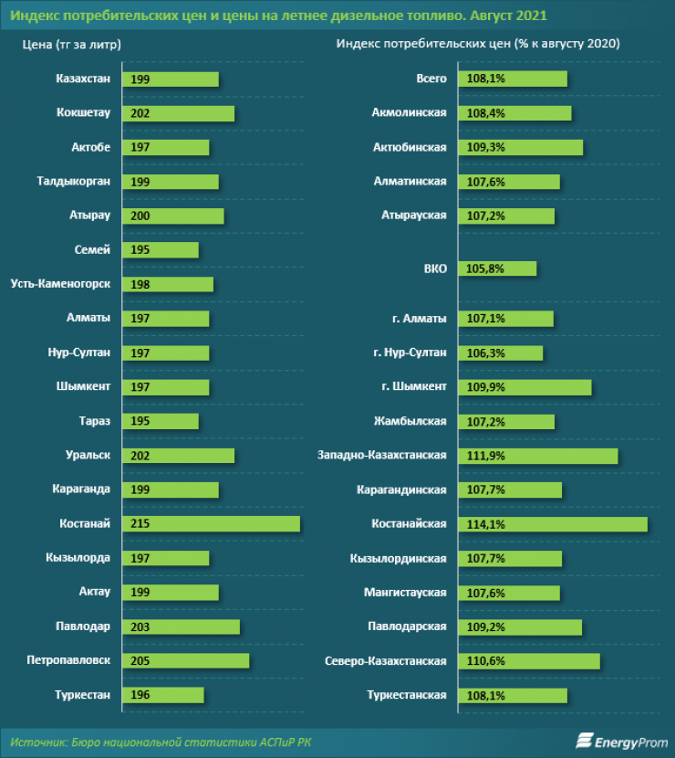 По итогам августа этого года стоимость летнего дизельного топлива выросла сразу на 8,1 процента за год - до 199 тенге за литр.