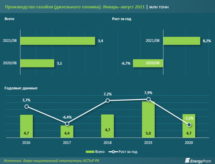 За январь-август 2021 года в стране произвели 3,4 миллиона тонн дизтоплива, на 8,2 процента больше, чем годом ранее. Наибольший объем производства пришелся на Павлодарскую (1,3 миллиона тонн, плюс 25,3 процента за год) и Атыраускую (1 миллион тонн, плюс 1,3 процента) области. Для справки: в целом за 2020 год производство топлива в стране ожидаемо сокращалось на 7,1 процента до 4,7 миллиона тонн.
