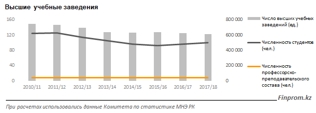 На начало 2017/2018 учебного года в Республике Казахстан действовало 127 высших учебных заведений (с учетом филиалов).