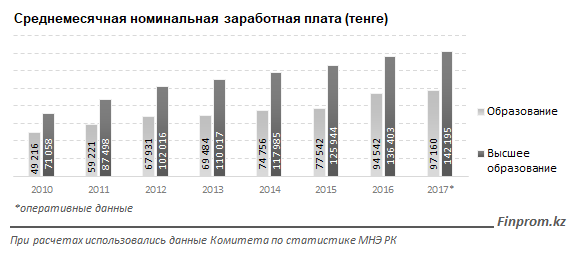 По итогам 2017 года заработные платы в сфере образования составляли 97,16 тысячи тенге, в сфере высшего образования - 142,2 тысячи тенге, сообщают аналитики Finprom.kz.