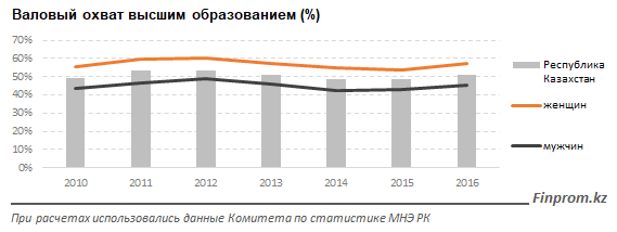 Валовый охват высшим образованием достиг в Казахстане 51,1 процента, причем для женщин этот показатель (57,3 процента) значительно выше, чем для мужчин (45,2 процента).